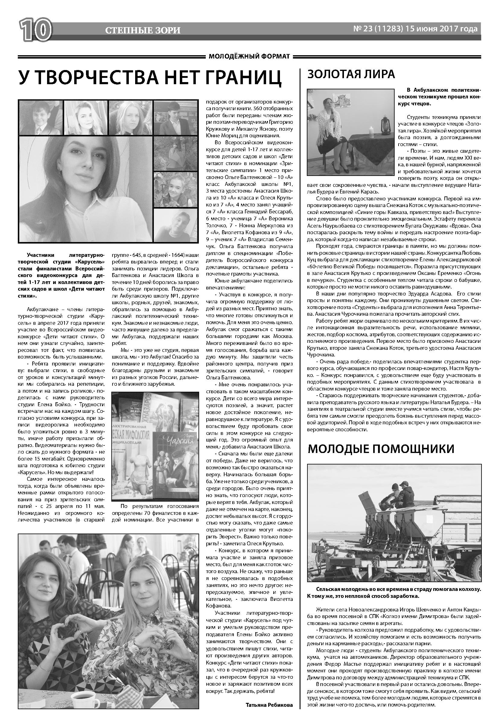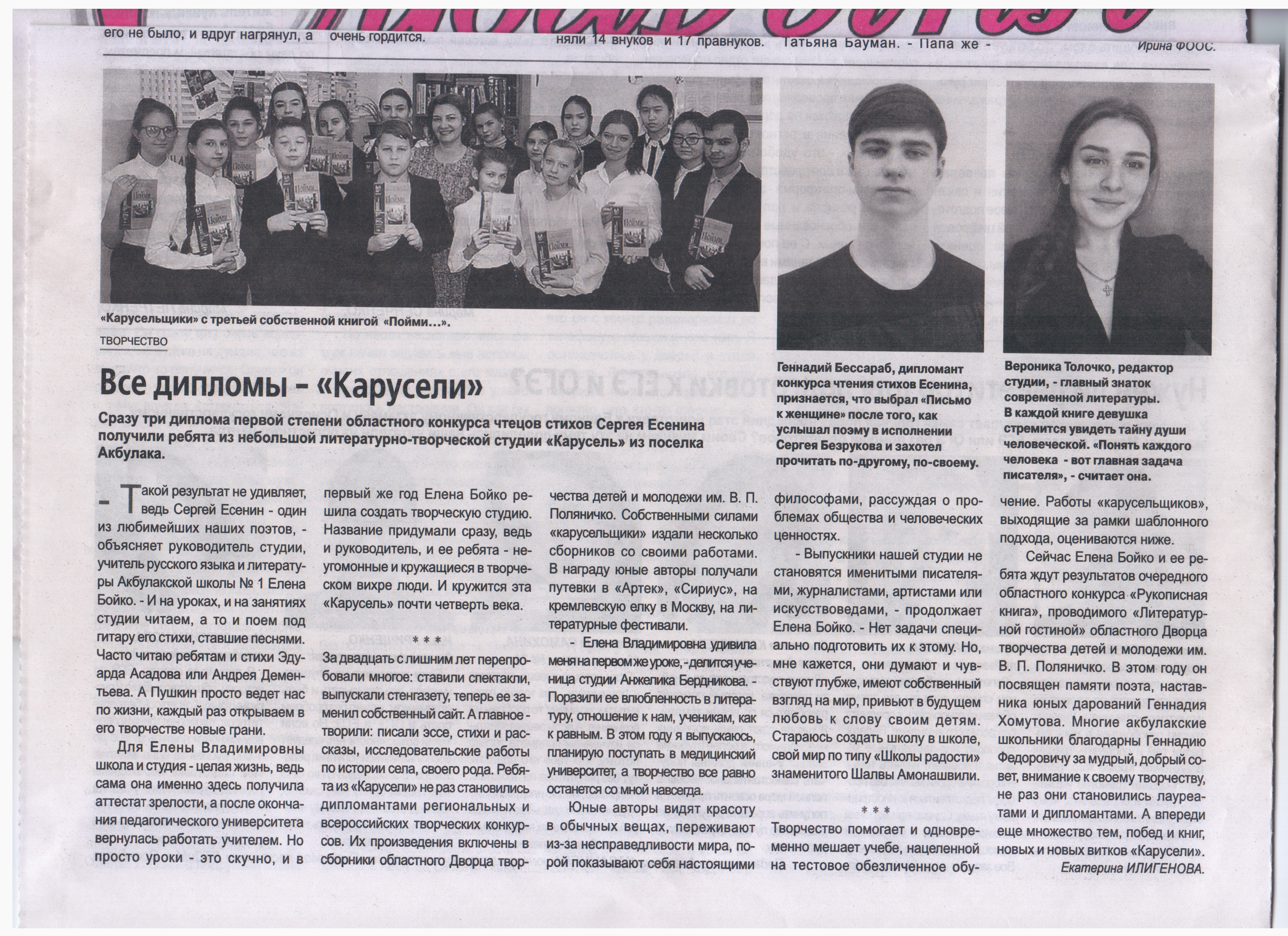 На следующем этапе Ищенко Таня читала гениальное стихотворение А.С.Пушкина «Осень». Глубокое лирическое произведение, удачное исполнение очаровали зрителей и жюри. На вечере поэзии участники фестиваля читали свои собственные произведения. Акбулакчанке – «карусельщице» удалось познакомить ребят и взрослых с собственным эссе «Счастье – читать Пушкина». Каковы же были наши эмоции, когда мы узнали, что Таня завоевала приз зрительских симпатий и своеобразное имя – «Девушка Осень»!